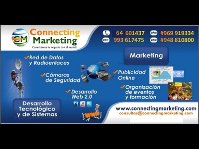 Connecting Marketing Group, empresa que se funda e inicia operaciones en Madrid - España, migra sus operaciones a Perú en enero del 2012 y actualmente está presente en las oficinas de Lima y Huancayo. Connecting Marketing, empresa que brinda servicios en Marketing y Desarrollo Tecnológico, cuenta con un equipo de expertos profesionales con reconocida trayectoria en marketing y tecnología, con más de 15 años de experiencia en el mercado nacional e internacional.